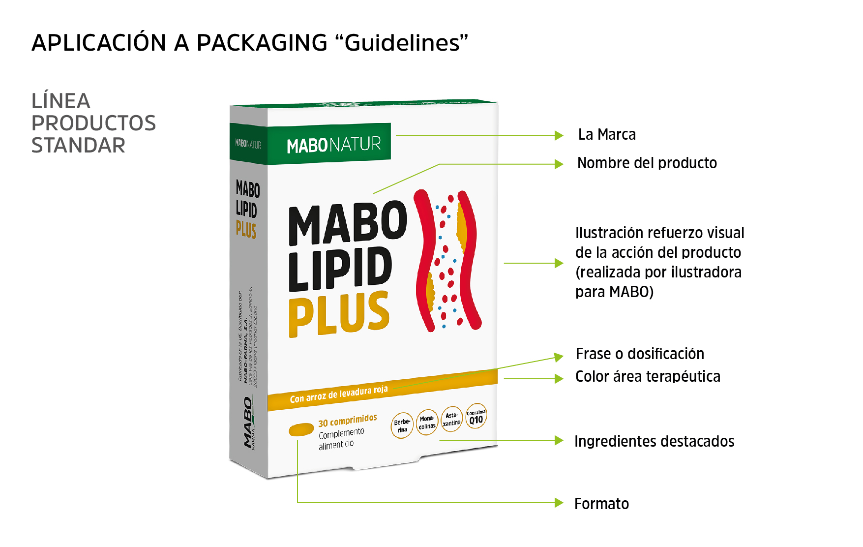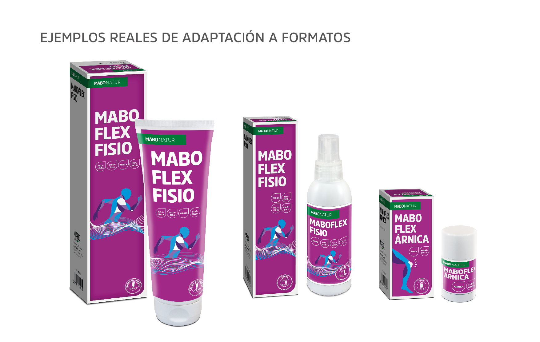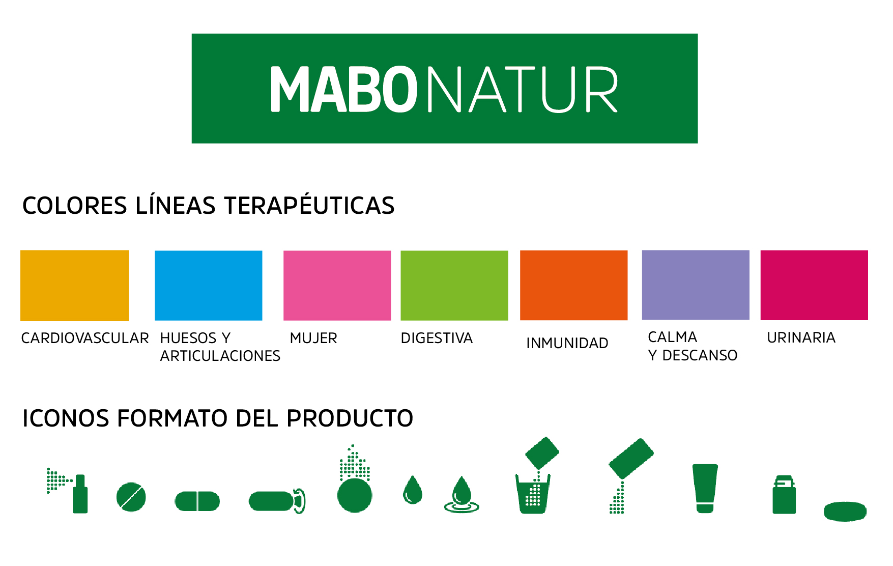 Elegimos la tipografía corporativa de MABO, creamos una gama cromática para las distintas áreas terapéuticas en las que se irán agrupando los productos, grafismos e iconos para hacer más visual el formato o presentación (spray, comprimidos, crema,…) y encargamos a una ilustradora el dibujo que representa la acción o virtud principal del producto para crear un código único para MABONATUR.
