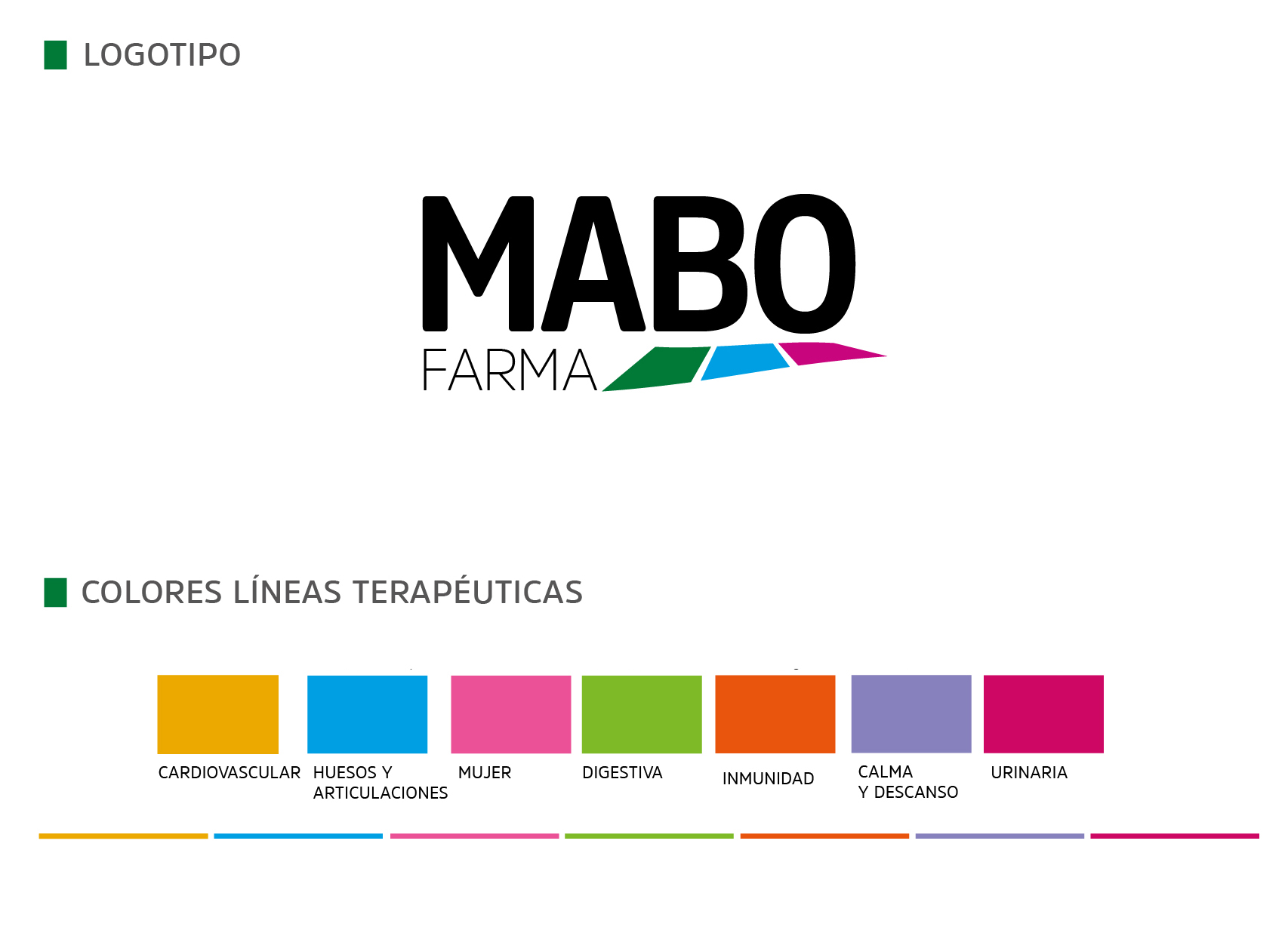 Se optó por la línea gráfica más continuista a nivel tipográfico con la nueva casa madre croata (PharmaS), priorizando en el nombre el tamaño de MABO sobre Farma, ya que MABO es como se conoce a este laboratorio entre los farmacéuticos (sus principales clientes). Pero MABO tenía que crecer y albergar nuevas áreas de negocio, representadas en su “ola” segmentada en las 3 áreas principales: